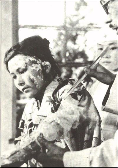 Tsutomu Yamaguchi, l’architecte naval, était en train de marcher dans un champ de pommes de terre et s’approchait d’une femme vêtue d’un mompe noir lorsque quelque chose ressemblant à l’ampoule de flash au magnésium d’un photographe resplendit devant lui. Réagissant sur-le-champ en appliquant ce qu’il avait appris lors de son entraînement aux attaques aériennes dans la marine, M. Yamaguchi plongea à terre et roula jusqu’au fossé d’irrigation le plus proche tout en portant vivement ses mains à son visage : il plaça alors ses doigts sur ses yeux et enfonça ses pouces dans ses oreilles afin de les protéger. Même les oreilles bouchées de la sorte, le bruit qui parvint à Yamaguchi fut terriblement assourdissant.